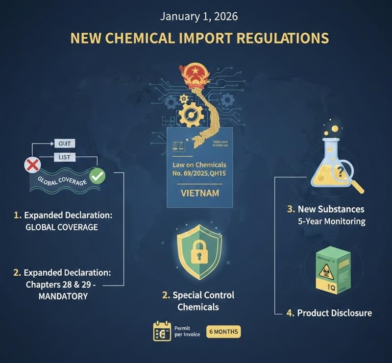 越南在 2026年1月1日 起正式實施了全新的**《化學品法》(Law on Chemicals, No. 69/2025/QH15)**。這是越南自2007年以來對化學品監管框架最大規模的一次修訂。